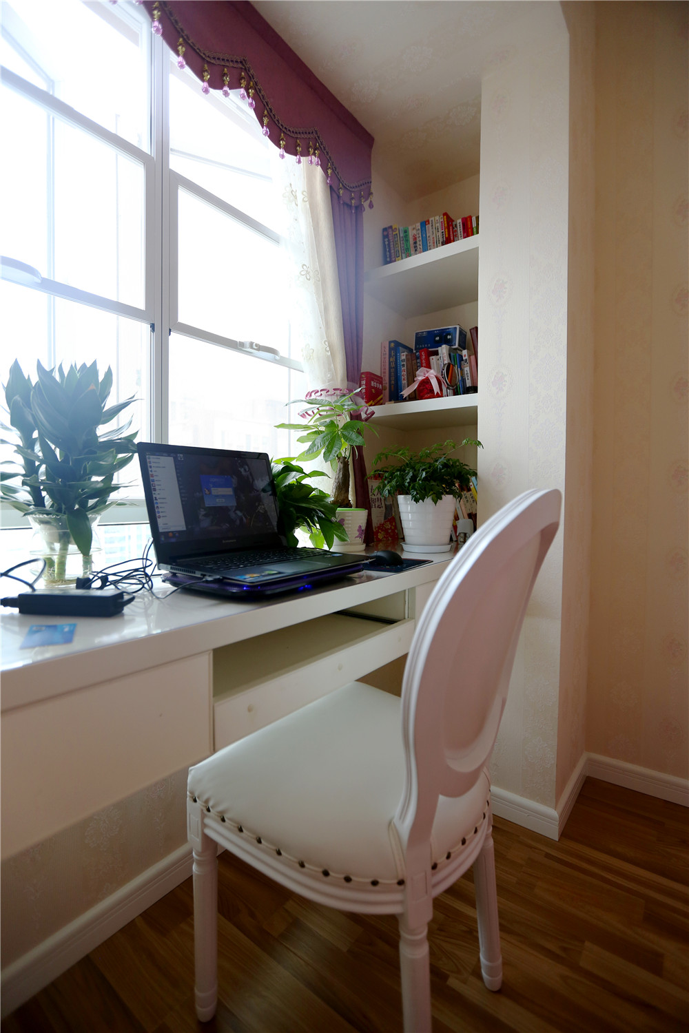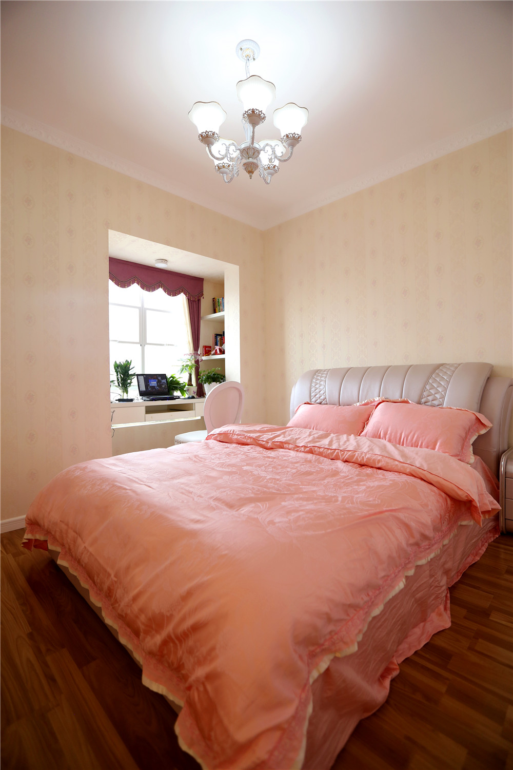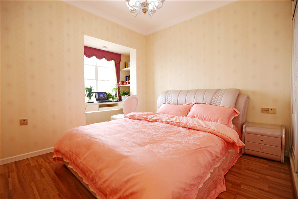 主臥柔軟的大床、粉嫩的床單,在陽光照進飄窗時美到極致,溫馨的軟裝更有助于睡眠。將飄窗設(shè)計成工作臺,既可收納又可辦公,讓職場上的‘女強人’可以舒適的在家加班。