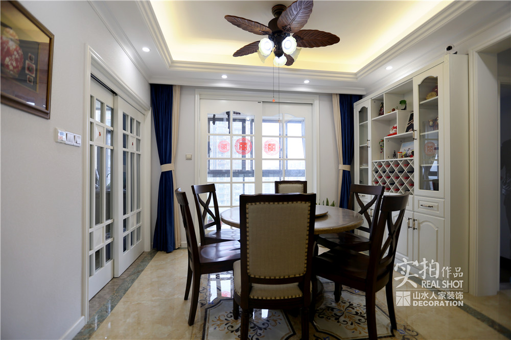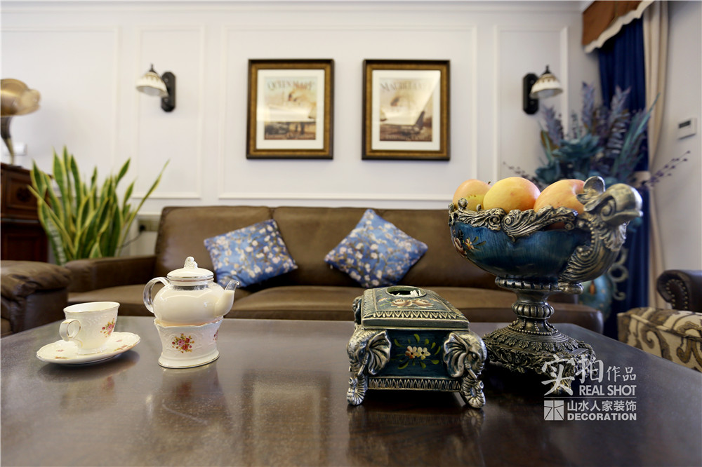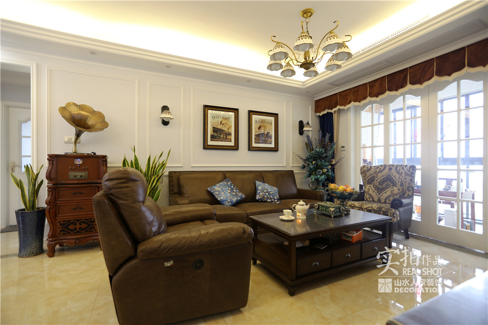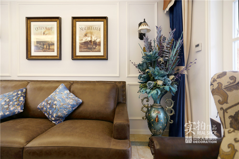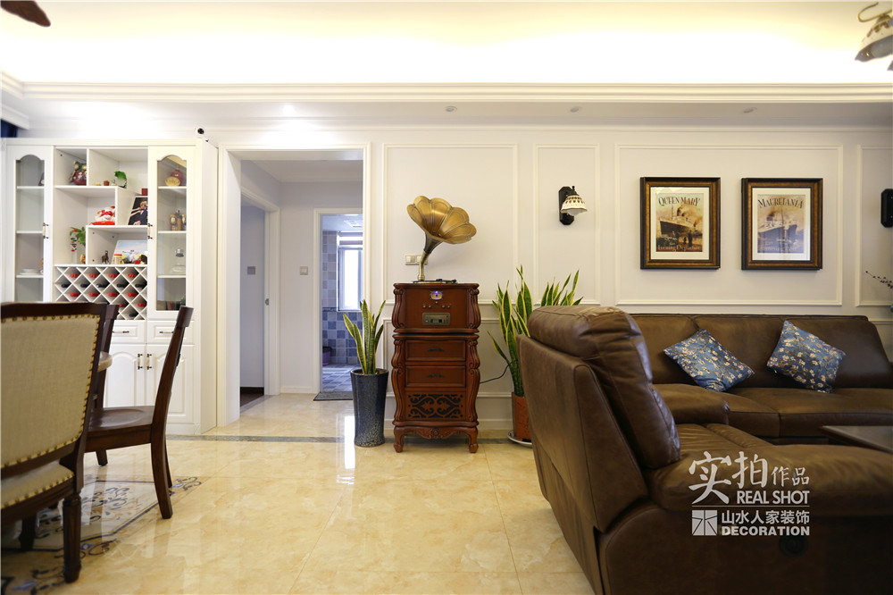 客廳的電視背景墻運(yùn)用了木質(zhì)墻板,沙發(fā)背景空間用PU線條上墻,做出仿制墻板的感覺(jué),前后呼應(yīng)。這樣做的好處是,既提煉了美式的表現(xiàn)元素,也附帶一些現(xiàn)代氣息,增強(qiáng)時(shí)尚感。
