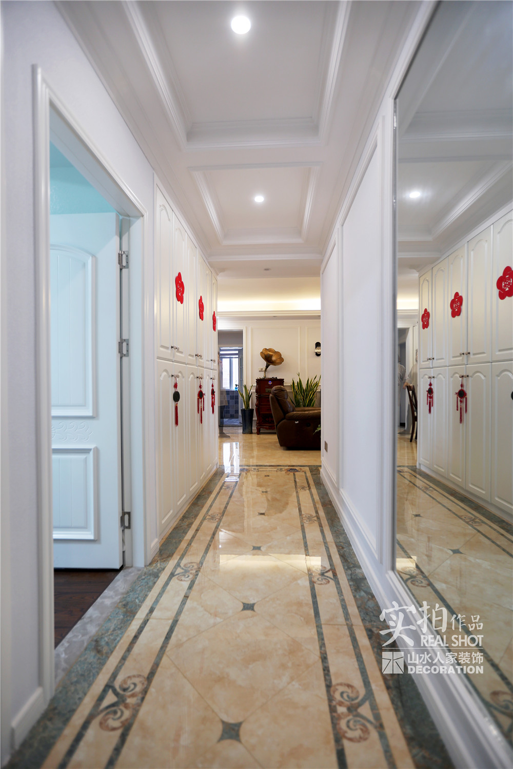 從整體來(lái)看,房間布置除了盡可能增大客廳、餐廳活動(dòng)空間之外,門廳入口也盡可能做大了。門廳的空間拼花磚,配上有現(xiàn)代銀鏡的穿衣鏡,擴(kuò)大空間感,讓長(zhǎng)廊走起來(lái)更有氣勢(shì)。門口的墻面掛飾增強(qiáng)了儀式感。后期在另一面墻體可做成照片墻的形式,一起回顧往昔邁步向前。