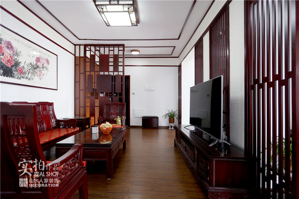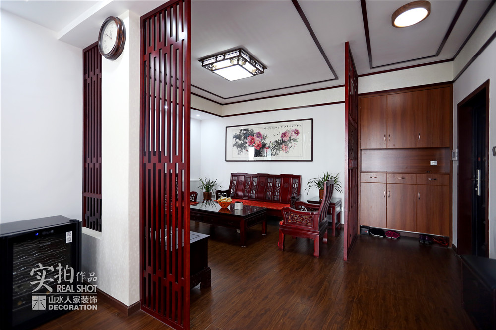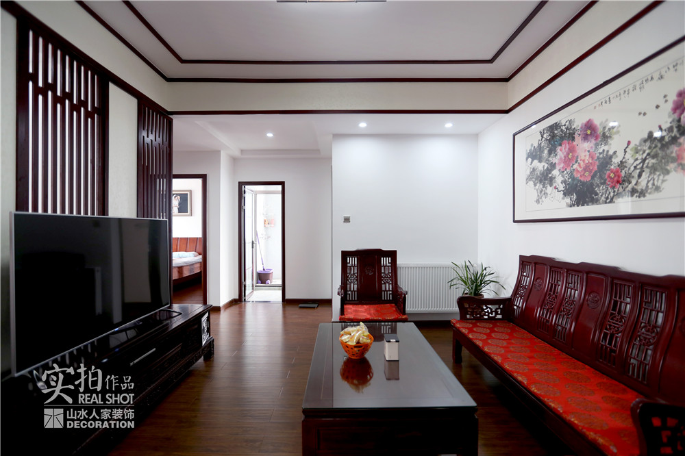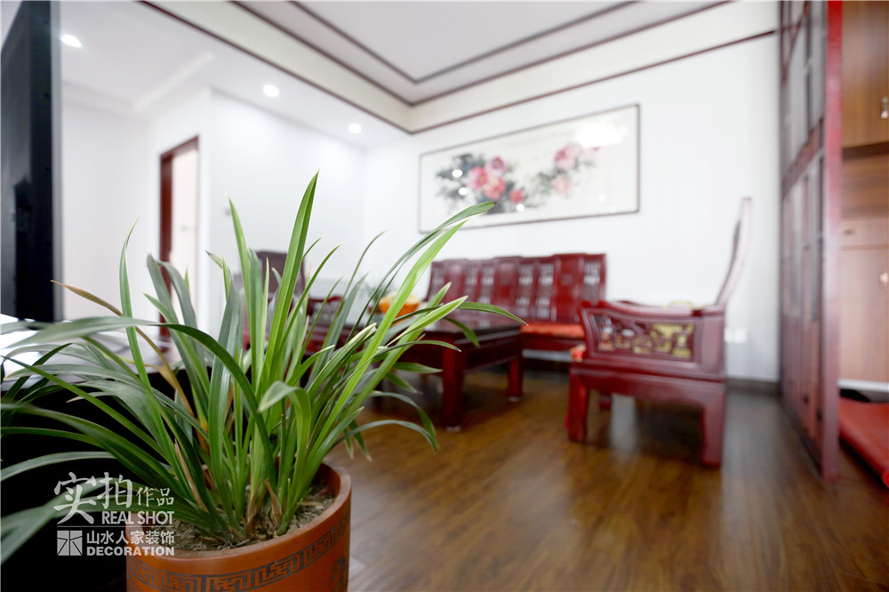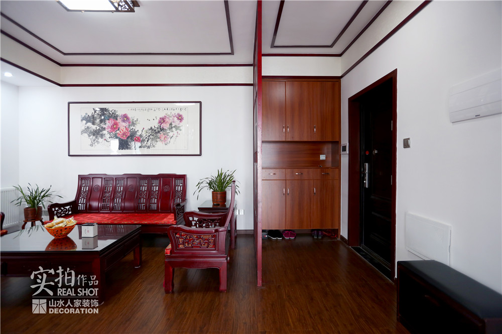 設(shè)計(jì)說(shuō)明:業(yè)主是退休了的職工,所以對(duì)于家庭裝修上的要求相對(duì)更偏向于實(shí)用環(huán)保,但對(duì)于男主人而言更多的希望能把自己對(duì)于古玩字畫(huà)的興趣添加在自己生活的空間中。所以也就有了后期風(fēng)格上的基本定位,結(jié)合業(yè)主已經(jīng)購(gòu)買(mǎi)了一組實(shí)木紅木家具的實(shí)際情況,特意在對(duì)于客廳的空間布局上做出了相對(duì)應(yīng)的安排。