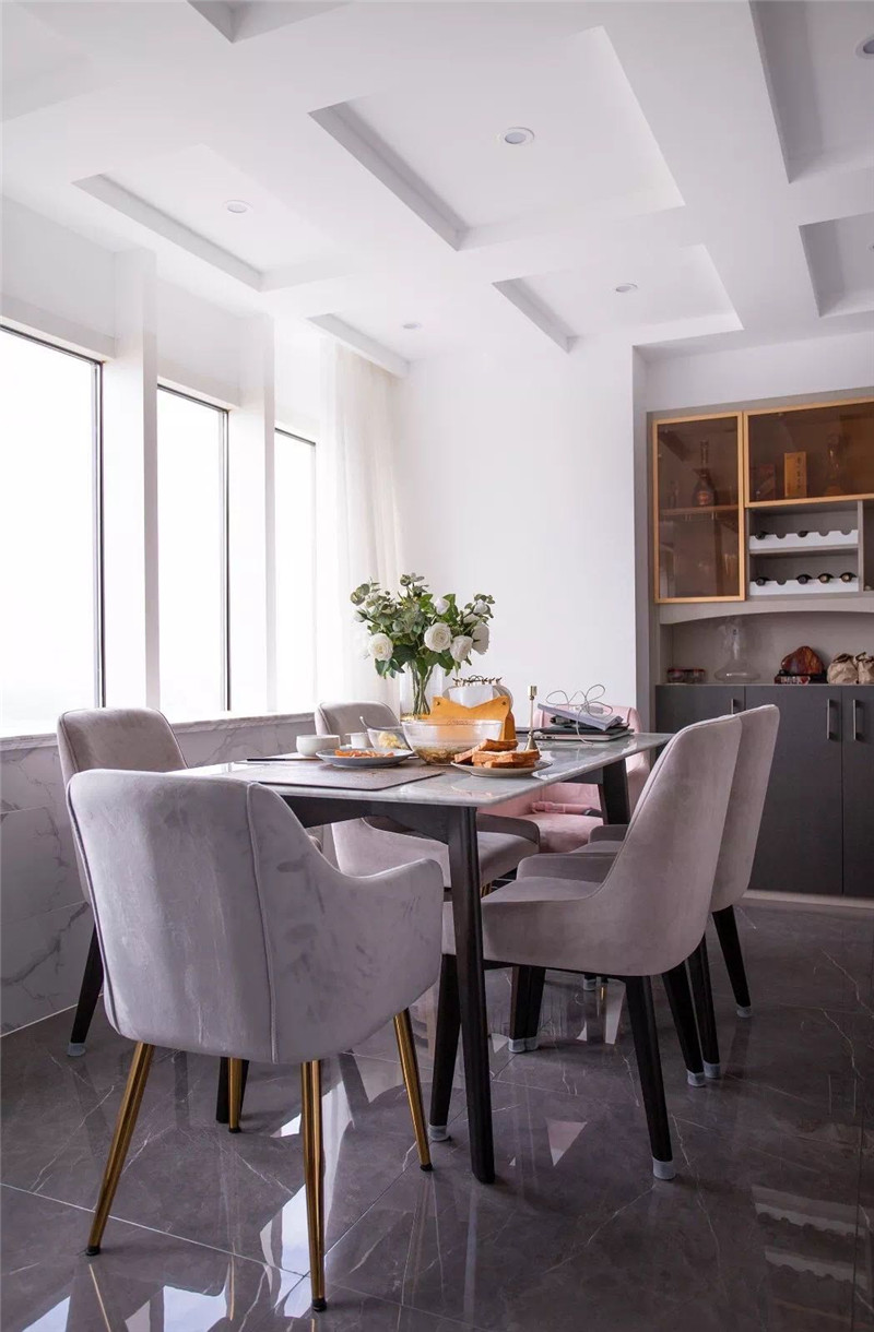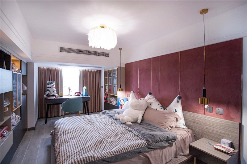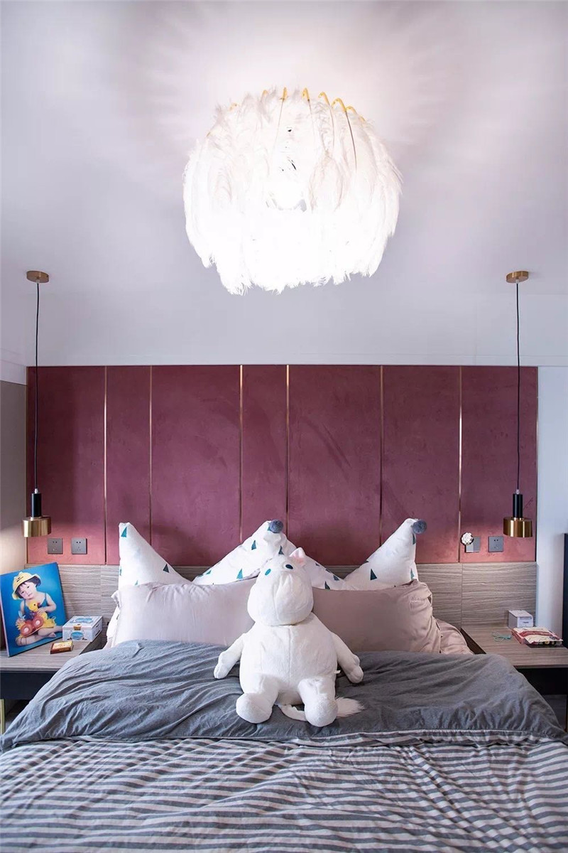 因房子在江邊,東南兩側(cè)全景玻璃,采光充足,在地磚.地板.柜體.臥室門等的選色上,特意選擇了較暗的色系,讓明暗形成互補(bǔ),在樓梯間與主人房制作粉色的涂料與軟包,特顯女主人的高雅品位,同時讓空間色彩豐富而別致。