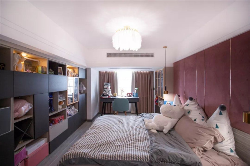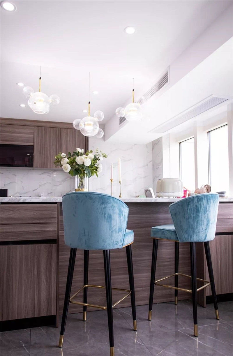 設(shè)計(jì)操作:嚴(yán)格按照空間比例劃分,把樓板定制在最合理位置,保證一層與二層的高度都在2.4米以上,同時把樓梯間上方充分利用,讓二樓空間增加了20平的面積.。同時廚房采用了敞開式做法,制作了吧臺。并且在二樓預(yù)留了敞開式茶室,同時劃分了4個臥室,滿足家庭,朋友聚會使用。女主人的臥室兼具書房,衣帽間,玩偶柜等空間,增加使用的舒適性。