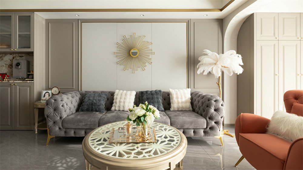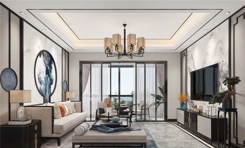 客廳以柔和的淺米黃硅藻泥和木飾面來奠定溫馨的主色調,背景墻護墻板和四聯(lián)動大板磚相結合,搭配新中式深色榫卯工藝家具,穩(wěn)重大氣。