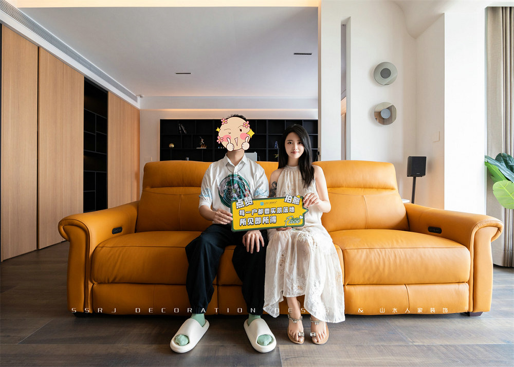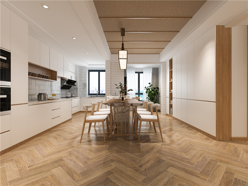 本案在量房時(shí)通過儀器測(cè)試發(fā)現(xiàn)餐廳陽臺(tái)墻體皆為承重墻,對(duì)于這一區(qū)域定位尤為重要,后期經(jīng)過與業(yè)主交談中得到業(yè)主認(rèn)可,將餐廚合為開放式廚房,從而達(dá)到客餐廳達(dá)到空間上的巨大開闊;客餐廳采用無主光源設(shè)計(jì),簡(jiǎn)潔大方又滿足日常照明的需求,沙發(fā)背景與電視背景亞麻墻布與瓷磚的軟硬之間的碰撞形成了強(qiáng)烈的對(duì)比;