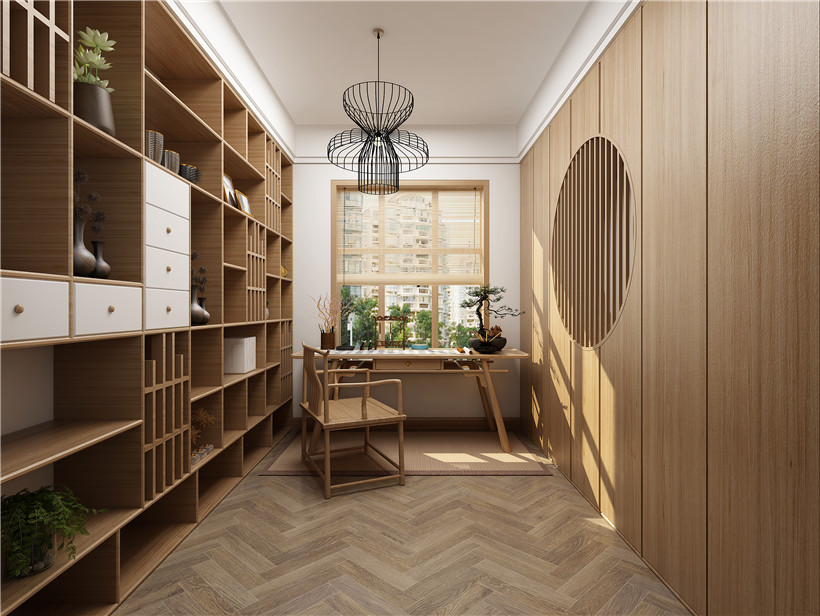 書房:全放木作依照日式風(fēng)格設(shè)計(jì),因業(yè)主對(duì)書籍儲(chǔ)存方面有著巨大的需求,故書桌邊設(shè)兩排頂天立地的大書架,格子和原木紋柜面的對(duì)應(yīng)使空間活潑不顯壓抑,另加圓形格柵此更加貼切日式的風(fēng)格,為點(diǎn)睛之筆。
