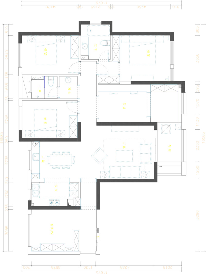 本案為三房?jī)蓮d,南北通透??臻g較為規(guī)整,進(jìn)門沒(méi)有獨(dú)立的玄關(guān)區(qū)域,且聯(lián)通著窄長(zhǎng)的餐廳區(qū)域。將餐廳劃分出部分空間,設(shè)計(jì)了一個(gè)開(kāi)放式的書(shū)房,滿足了女主人在家上網(wǎng)的需求,又增加了較多的儲(chǔ)物空間,補(bǔ)給進(jìn)門較為小巧的鞋柜。餐廳卡座的設(shè)計(jì),在增加儲(chǔ)物的同時(shí),也增添的趣味,同時(shí)釋放出了更大的通道便于出入廚房及書(shū)房。冰箱移至餐廳區(qū)域,讓廚房的空間更大化的利用,更好的滿足女主人對(duì)于臺(tái)面和儲(chǔ)物的需求。