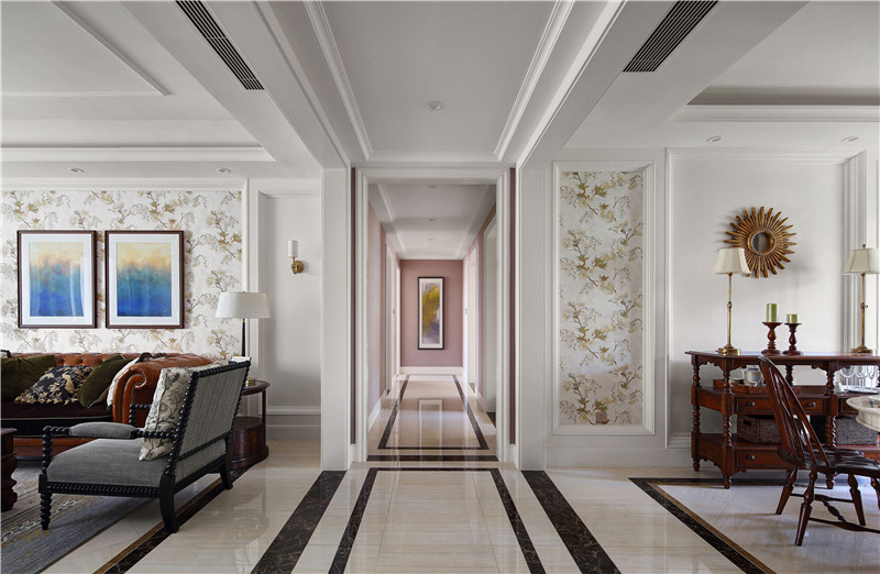 本案融合了美式的自然脫俗和法式的精致典雅,通過(guò)低純度的色彩,做舊的家具飾品,加上石材、鏡面、金色的點(diǎn)綴,使寧?kù)o而又精致的品位生活得以詮釋。