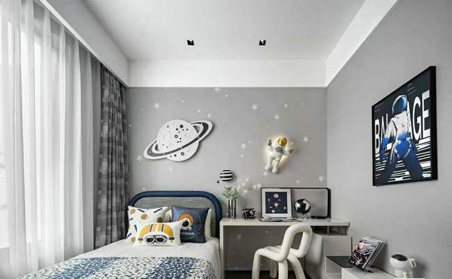 次臥設(shè)計(jì)更突顯功能性,主要是給家里小孩準(zhǔn)備的房間。床直接打滿了柜子,利于置物。同理靠墻定制了到頂白色衣柜,和床之間保留充足距離,方便抽拉柜體。