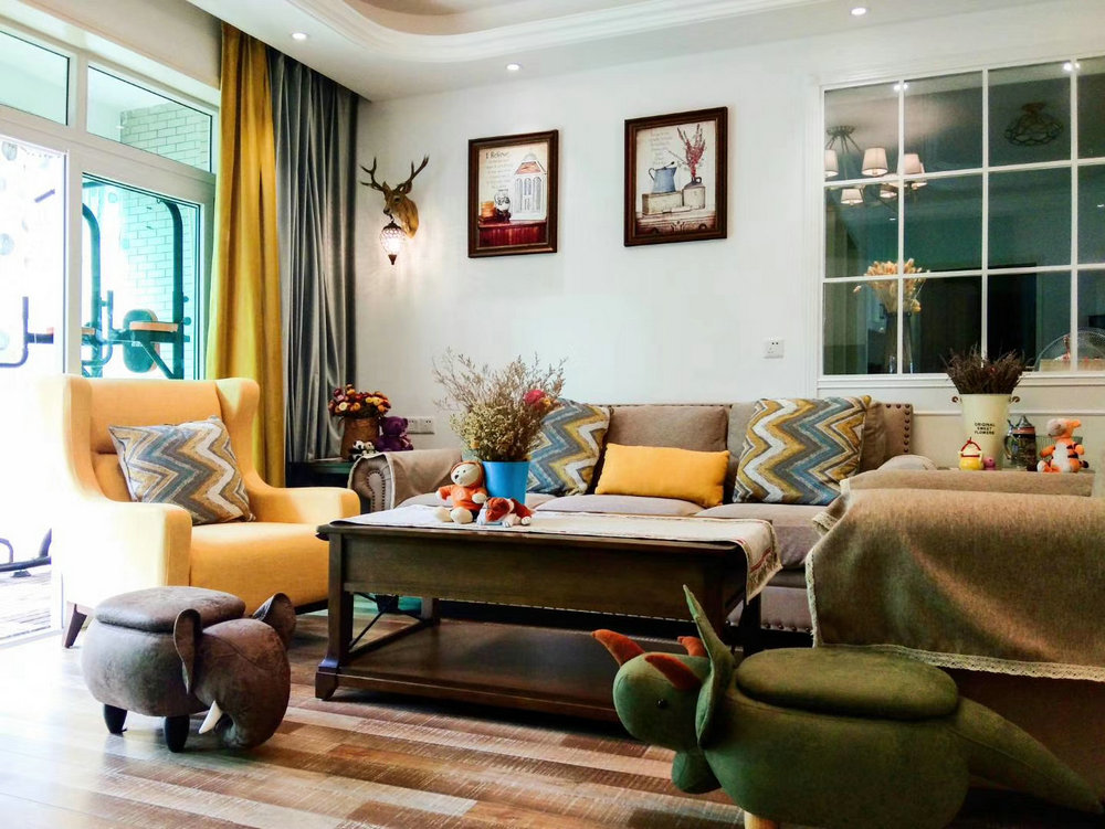 客廳中央擺放了一張白色布藝沙發(fā),給人以舒適的視覺感受。搭配圓形巖板茶幾和橘色毛毛蟲沙發(fā),彰顯優(yōu)雅時(shí)尚的氣質(zhì)。沙發(fā)沒有靠墻,留出充足的走道空間。后面是到頂?shù)恼故竟?,業(yè)主可以任意擺放物件。
