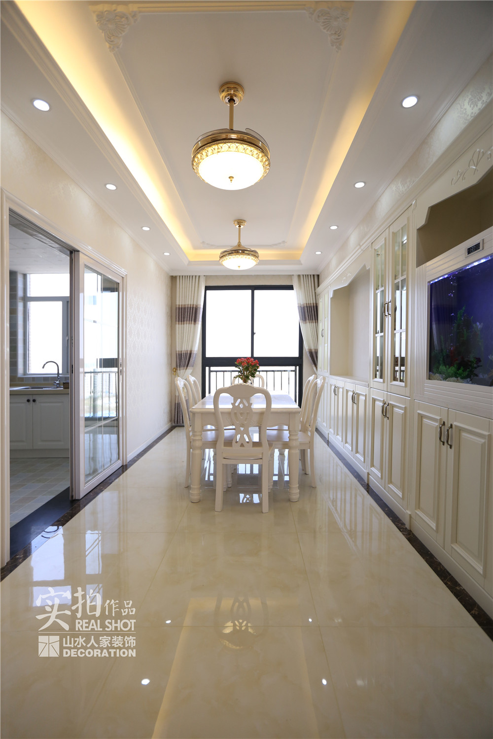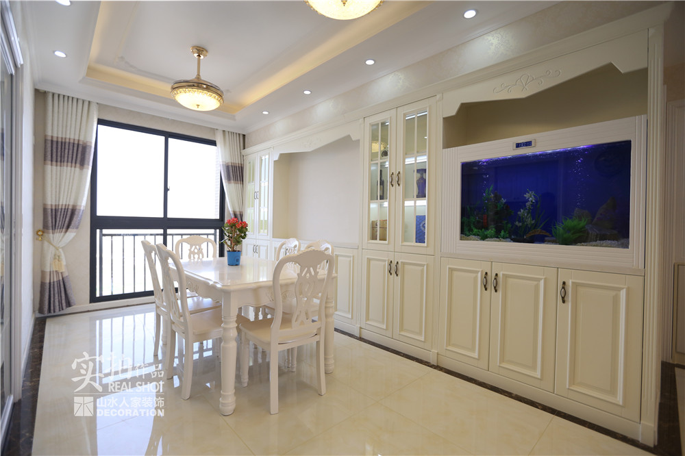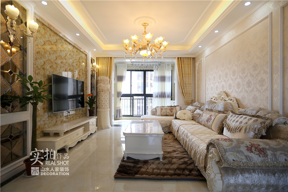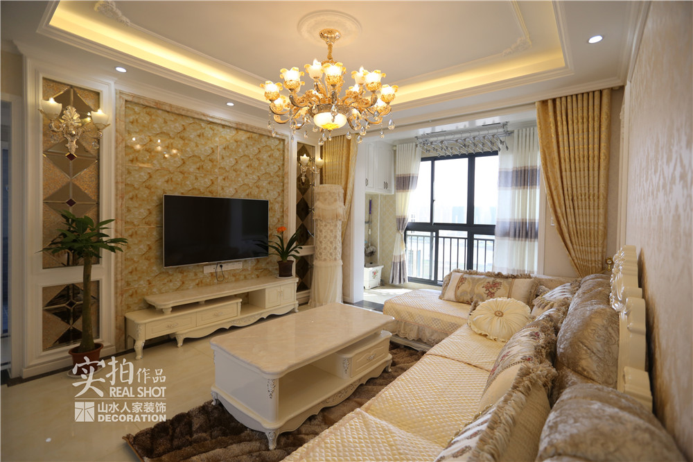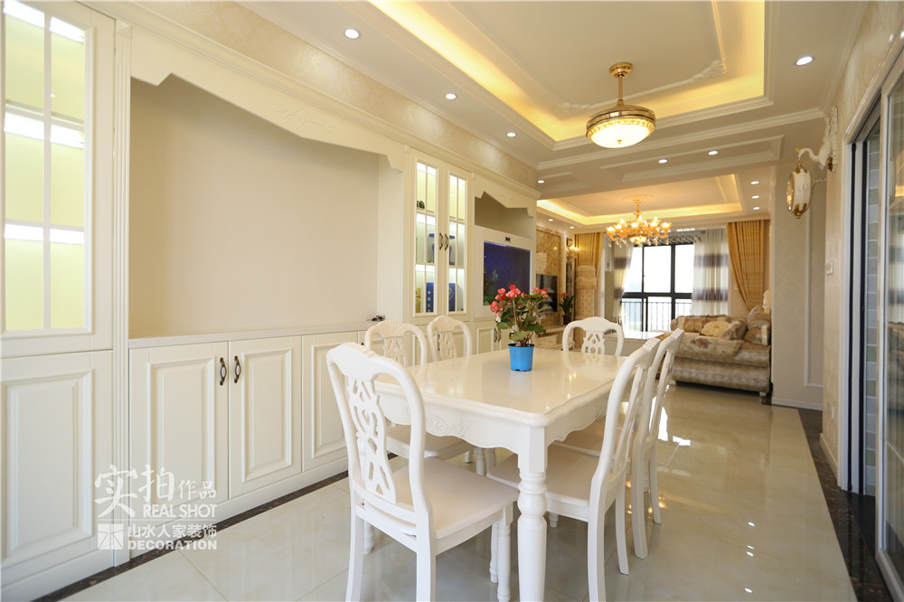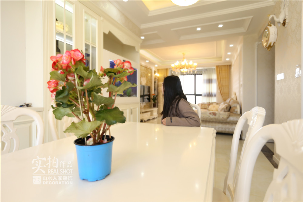 設(shè)計師根據(jù)業(yè)主的需求,在客餐廳區(qū)域用黃、白色墻紙做為基礎(chǔ)色,同時采用大量極具風(fēng)味的彎腿家具,構(gòu)建了歐式風(fēng)格的雛形。同時,她拉伸了房間內(nèi)的線條感,使戶型的優(yōu)點一顯無余。