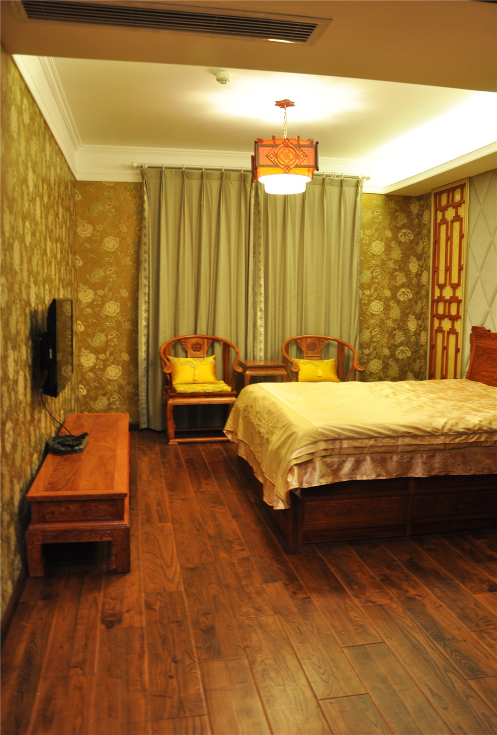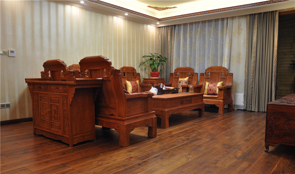 頂面的線條,雕花格和角花;墻面的護(hù)墻板,房門和雕花造型再到地面的家具地板搭配無不體現(xiàn)了“家”的和諧,裝飾風(fēng)格的呼應(yīng)統(tǒng)一。
