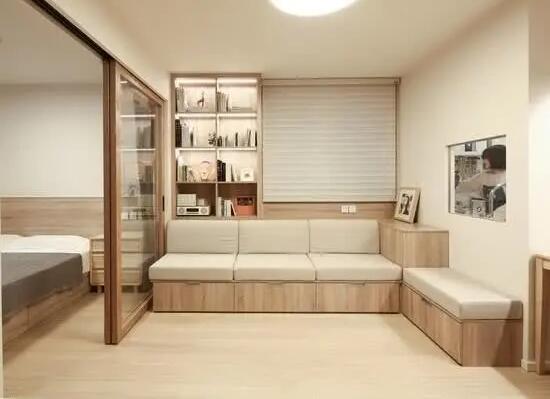 在小戶型的戶型圖里,往往會(huì)有一個(gè)面積極小的房間,當(dāng)作次臥空間太過于狹窄,也就被很多家庭閑置,慢慢變成了雜物間。其實(shí),如果這個(gè)房間與公共空間相連,不如把隔斷兩個(gè)空間的厚墻去掉,改用玻璃推拉門做隔斷,這樣就能充分?jǐn)U大室內(nèi)采光,給家居環(huán)境帶來(lái)明亮輕松的感覺,空間自然也會(huì)顯得更通透一些。